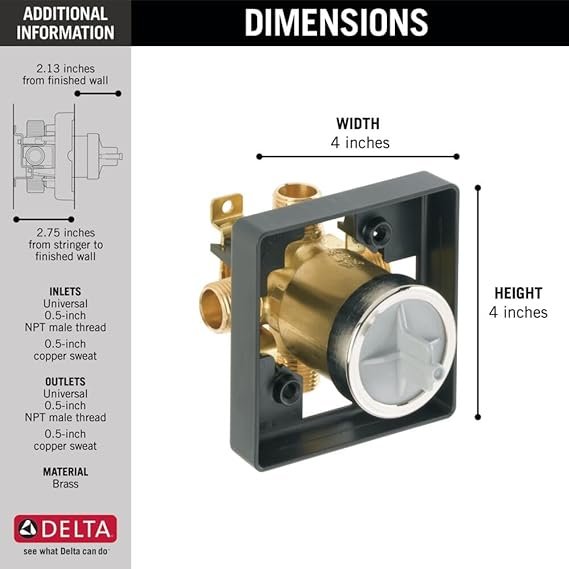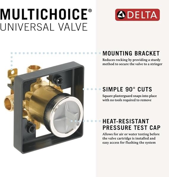 The Delta R10000-UNBX MultiChoice Universal Shower Valve Body provides lasting flexibility and reliability for bathroom upgrades. Designed with durable forged brass construction, this universal rough-in valve works with Delta 13, 14, 17, and 17T series trim kits, allowing you to change shower styles or functions without replacing plumbing behind the wall. Featuring versatile ½″ connections, back-to-back installation capability, and a pressure test cap for easy setup, it ensures long-term performance and future-proof convenience for any shower remodel.