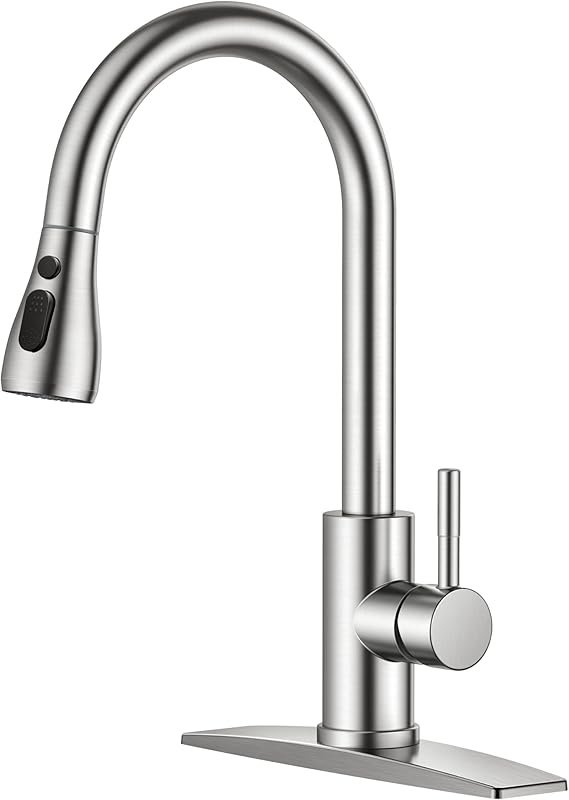 The FORIOUS Kitchen Faucet with Pull Down Sprayer combines modern design with practical functionality. Crafted from durable stainless steel, it features a high-arc spout and a single-handle lever for easy water control. The pull-down sprayer offers two spray modes, making it ideal for various kitchen tasks. Compatible with both 1- and 3-hole installations, it's a versatile choice for farmhouse, RV, or laundry room setups. Enhance your kitchen's efficiency and style with this sleek faucet.